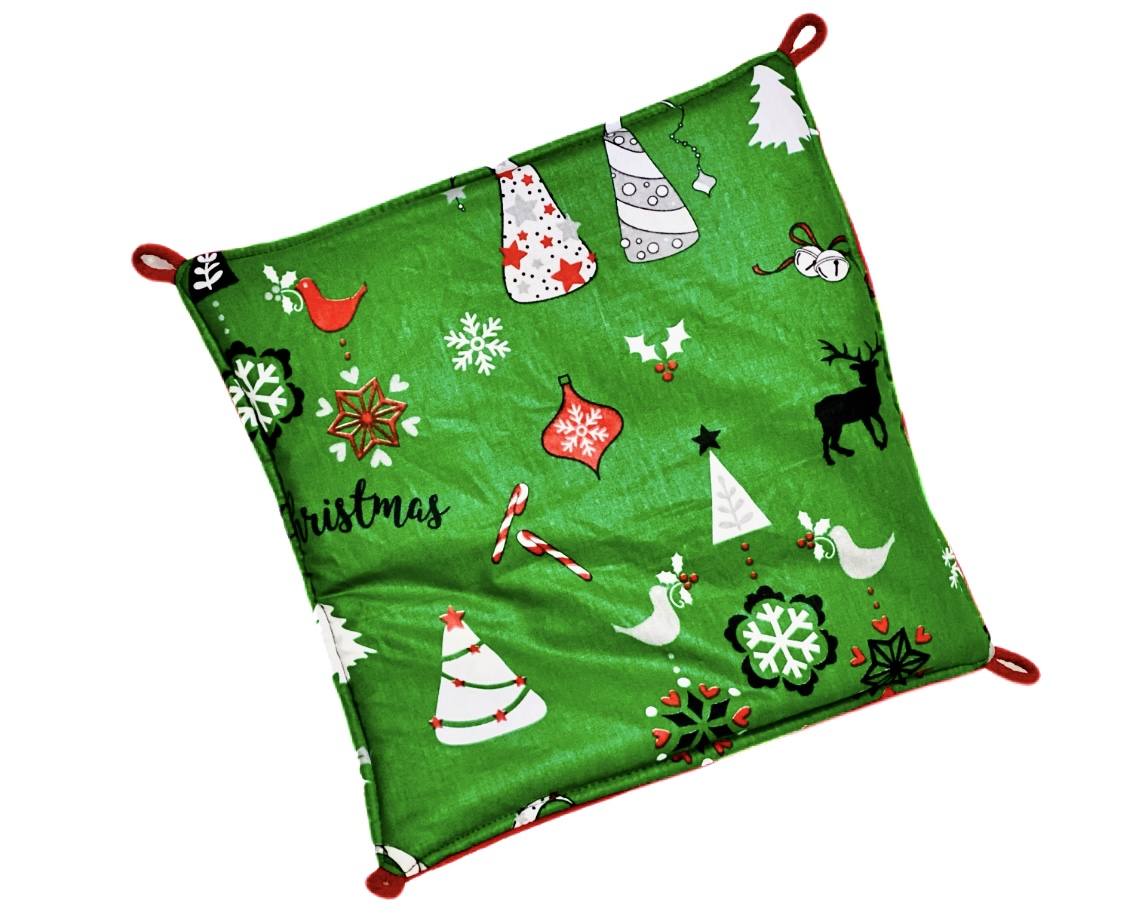 Unsere Hängematten sind alle in Handarbeit hergestellt. Die Oberseite ist aus Baumwollstoff im schönen Merry Christmas-Design und die Unterseite aus kuscheligem Vlies. An den Ecken befinden sich Schlaufen in der Farbe der Unterseite.